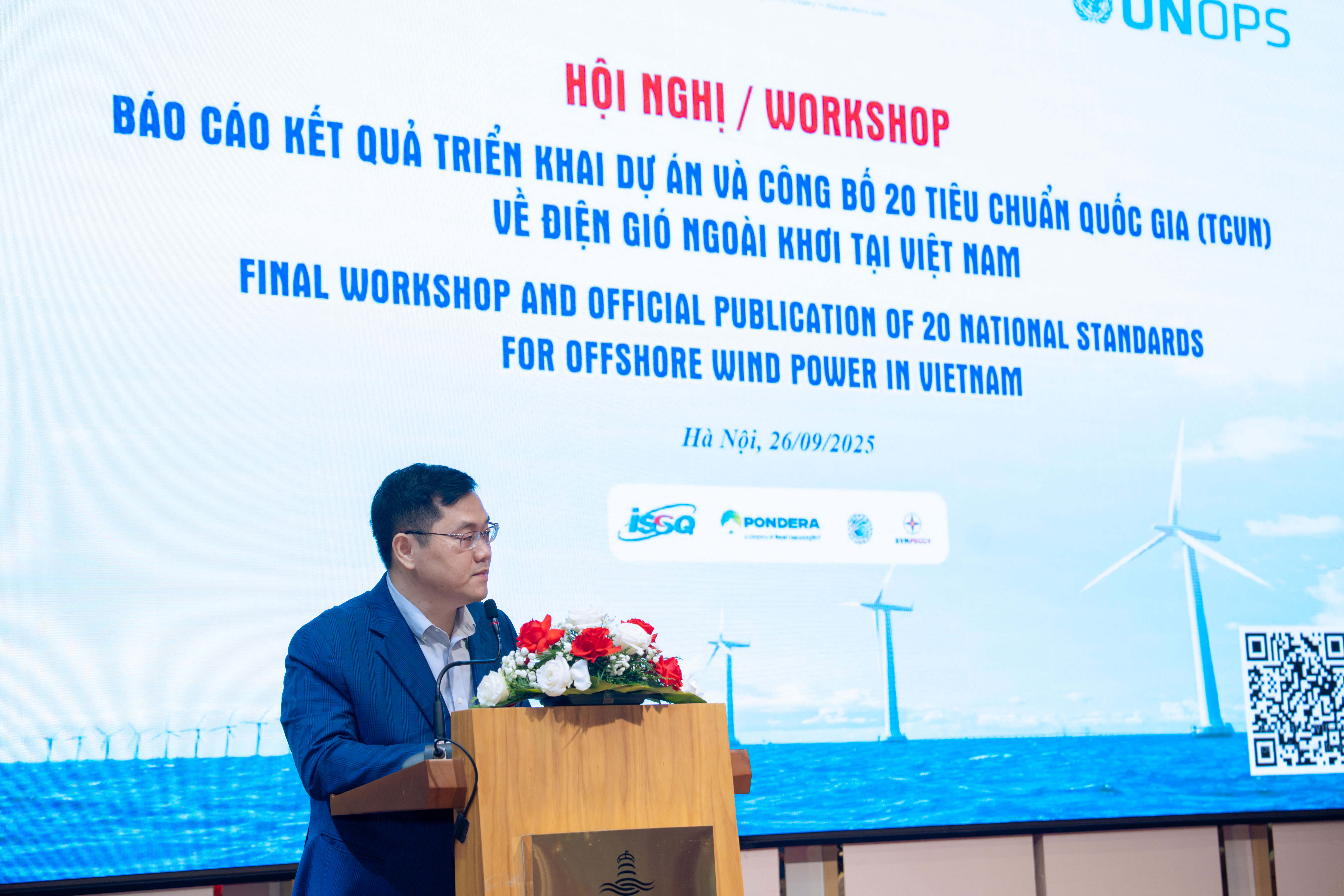 Ngày 26/9/2025 tại Hà Nội, được sự chấp thuận và hỗ trợ của Văn phòng Dịch vụ Dự án thuộc Liên Hợp Quốc (UNOPS), Quỹ Đối tác Chuyển dịch Năng lượng Đông Nam Á (ETP) và Uỷ ban Tiêu chuẩn Đo lường Chất lượng Quốc gia (STAMEQ) và các thành viên Liên danh tư vấn gồm: Viện Nghiên cứu Phát triển Tiêu chuẩn Chất lượng (ISSQ); Công ty TNHH Pondera Việt Nam (thuộc tập đoàn Royal HaskoningDHV); Trung tâm Quy hoạch và Điều tra Tài nguyên nước quốc gia (Nawapi); Công ty Cổ phần Tư vấn Xây dựng Điện 1 (PECC1) tổ chức Hội nghị báo cáo kết quả triển khai dự án và công bố 20 Tiêu chuẩn quốc gia (TCVN) về điện gió ngoài khơi tại Việt Nam.