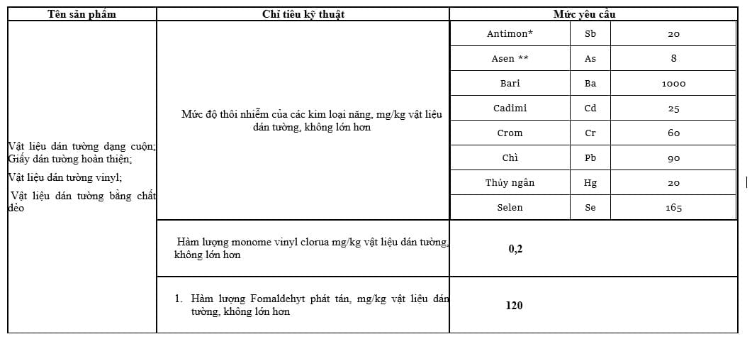 ** Mức giới hạn As không áp dụng đối với vật liệu dán tường đã được xử lý để chống vi khuẩn và chống nấm mốc.