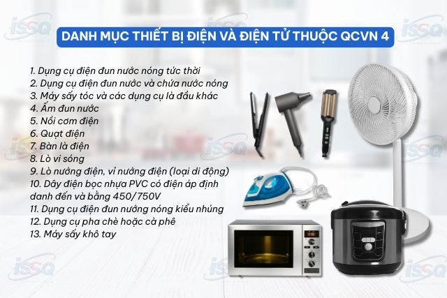 Danh mục này chủ yếu gồm các thiết bị gia dụng phổ biến, trực tiếp tiếp xúc với người tiêu dùng và có nguy cơ gây mất an toàn điện nếu không đạt chuẩn. Cụ thể bao gồm: