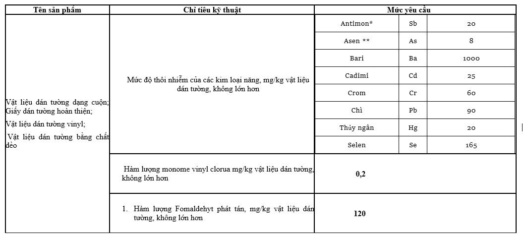 ** Mức giới hạn As không áp dụng đối với vật liệu dán tường đã được xử lý để chống vi khuẩn và chống nấm mốc.