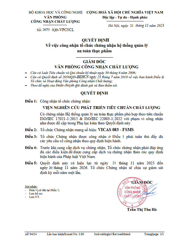 Từ ngày 21/11/2023 Viện Chất lượng ISSQ được công nhận theo Quyết định số 2075/QĐ-VPCNCL của BOA về việc công nhận tổ chức chứng nhận Hệ thống Quản lý An toàn Thực phẩm ISO 22000:2018 phù hợp theo tiêu chuẩn ISO/IEC 17021-1:2015 & ISO/IEC 22003-1:2022. Tổ chức Chứng nhận mang số hiệu: VICAS 083 - FSMS.