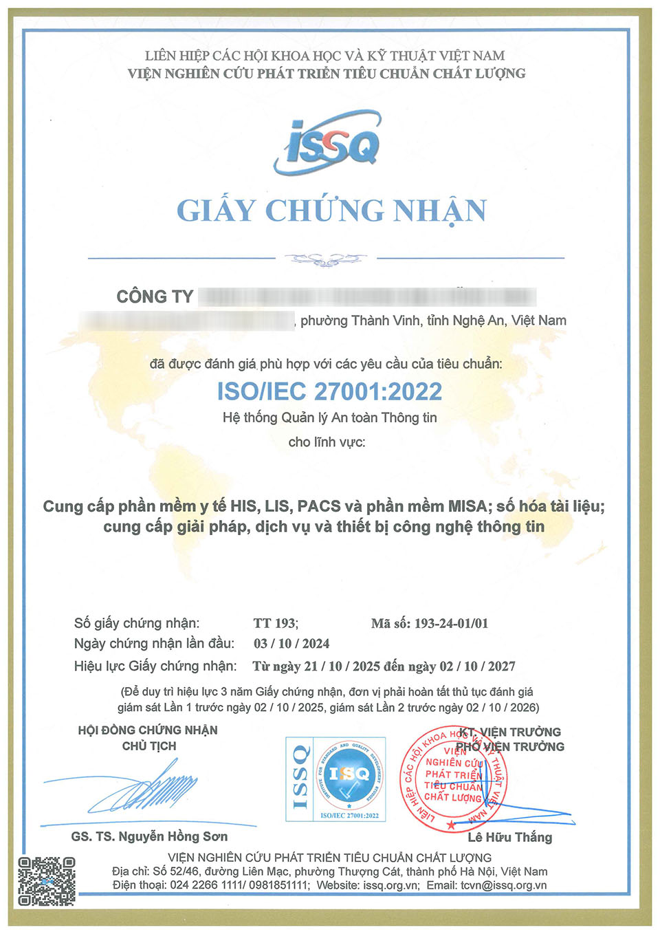 Tiêu chuẩn này là việc mà tổ chức chứng nhận (đánh giá bên thứ 3 – Viện chất lượng ISSQ) đánh giá một doanh nghiệp hay một tổ chức áp dụng cho hệ thống quản lý an toàn thông tin theo những điều khoản của chứng nhận ISO 27001.
