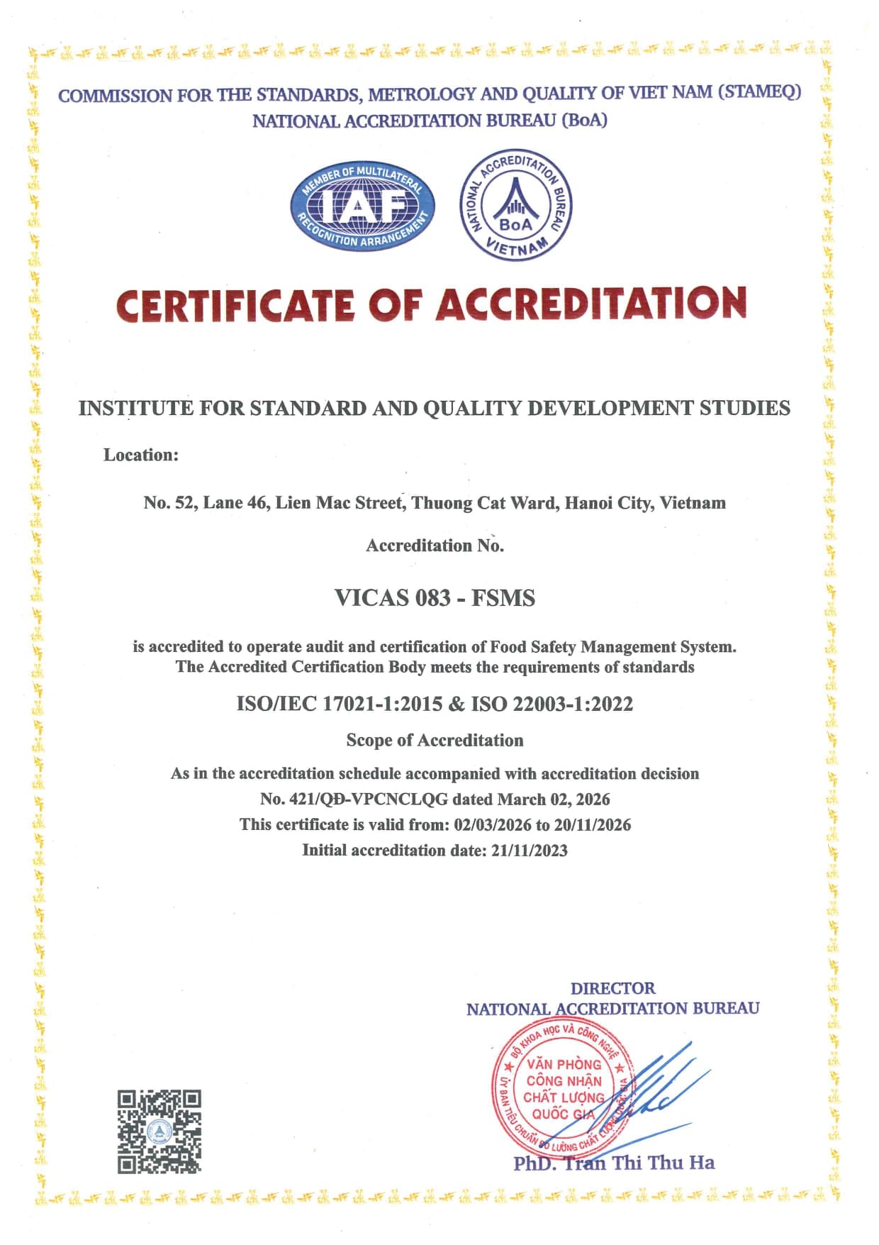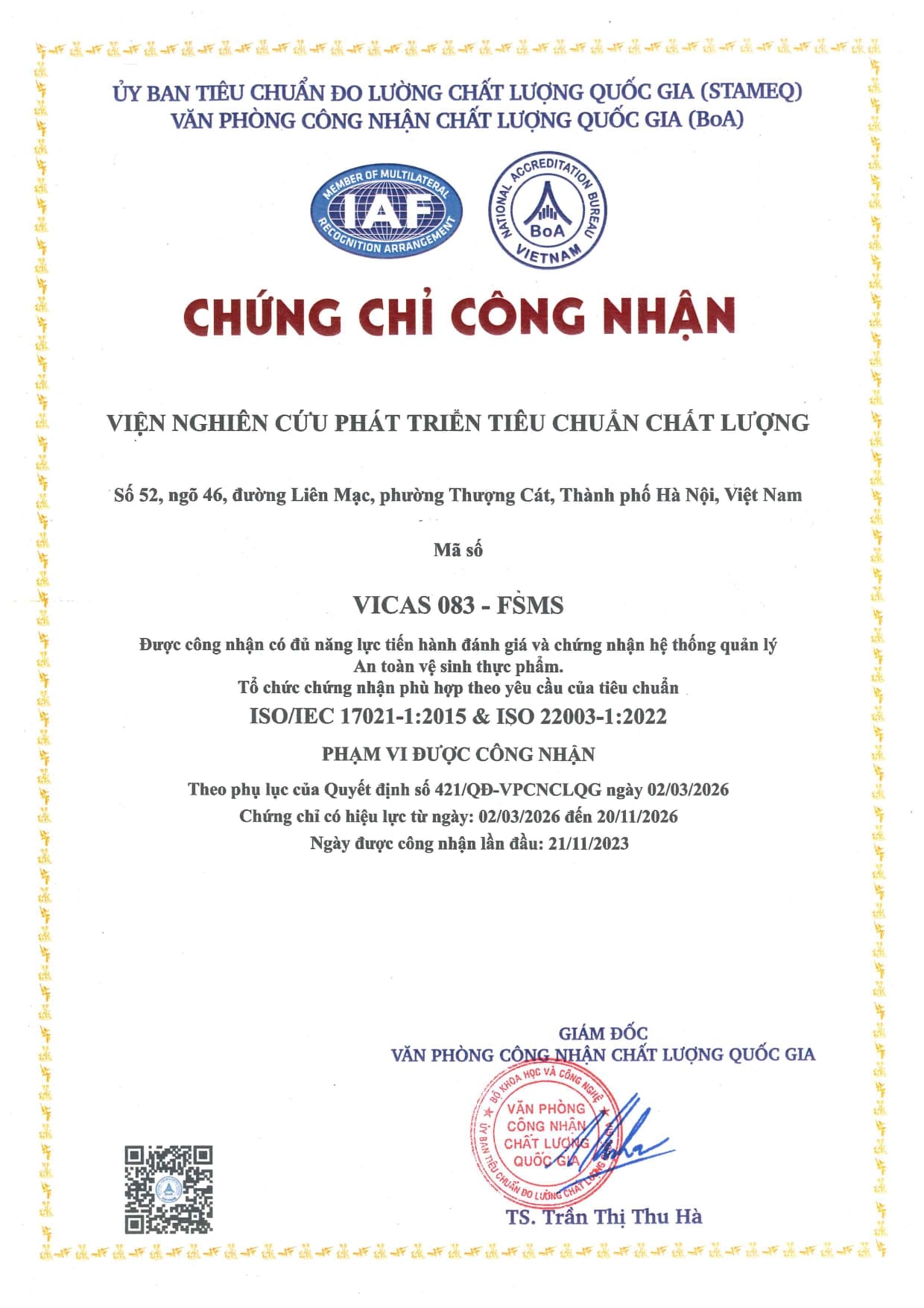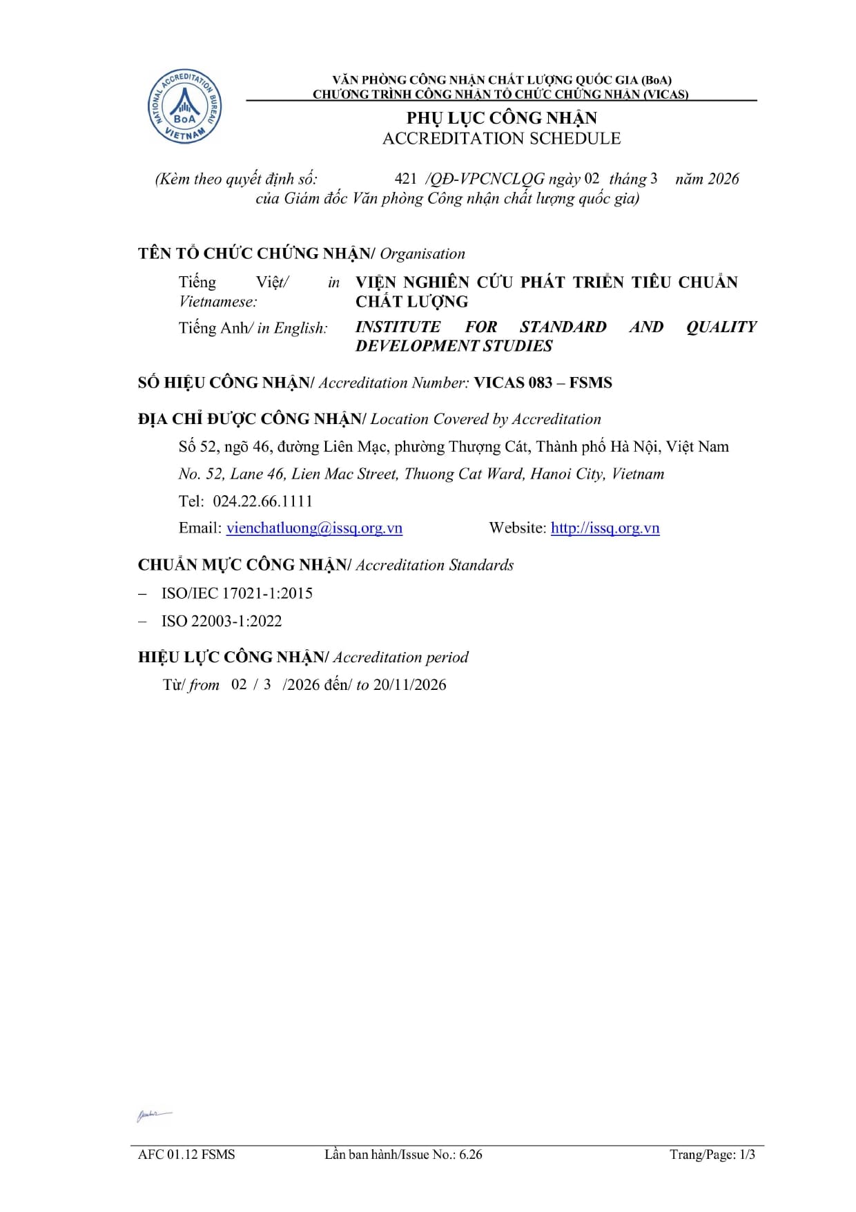 Từ ngày 02/03/2026 Viện Chất lượng ISSQ được công nhận theo Quyết định số 421/QĐ-VPCNCLQG của Giám đốc Văn phòng Công nhận chất lượng quốc gia (BoA) về việc công nhận tổ chức chứng nhận Hệ thống Quản lý An toàn Thực phẩm ISO 22000:2018 phù hợp theo tiêu chuẩn ISO/IEC 17021-1:2015 & ISO/IEC 22003-1:2022. Tổ chức Chứng nhận mang số hiệu: VICAS 083 - FSMS.