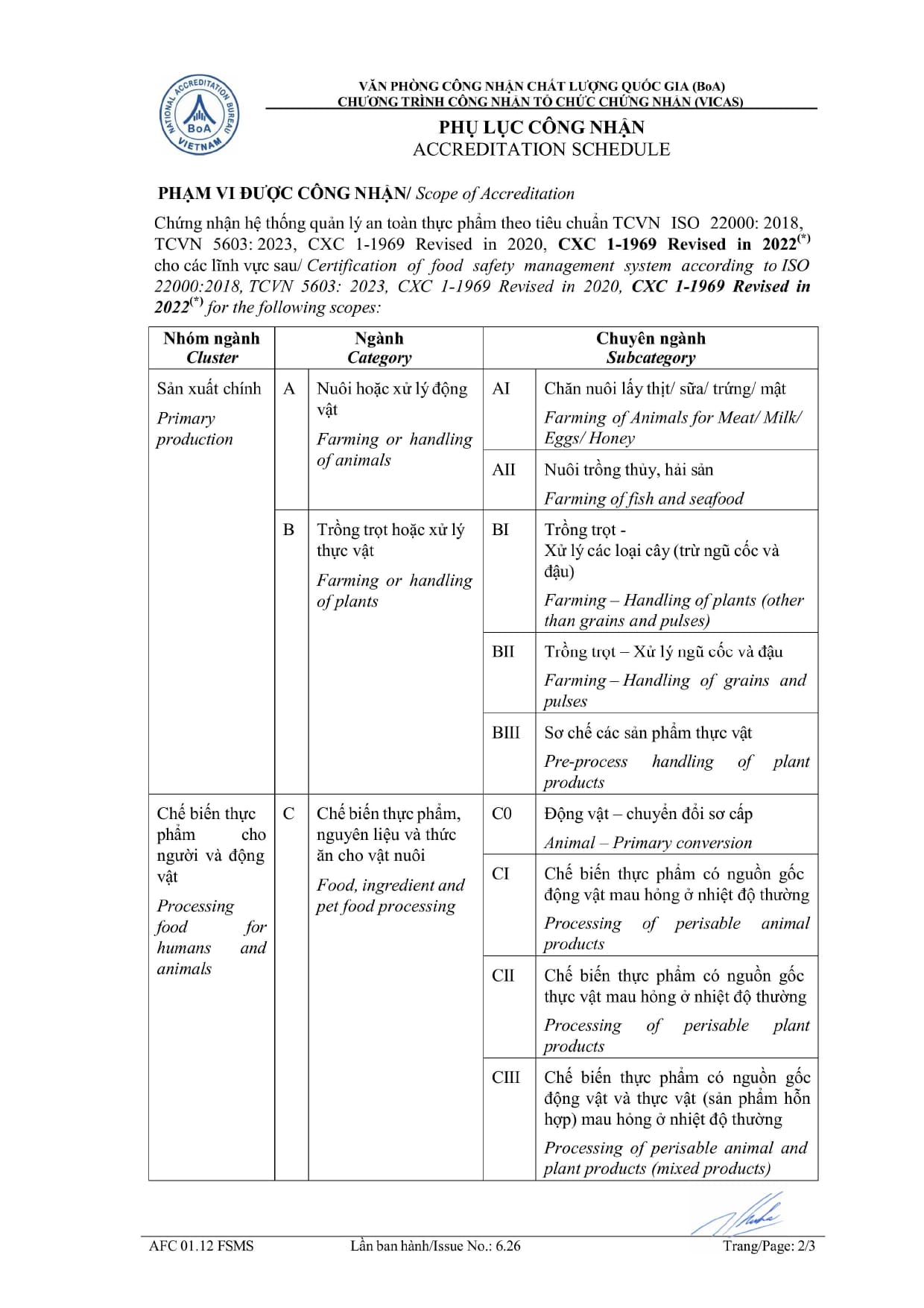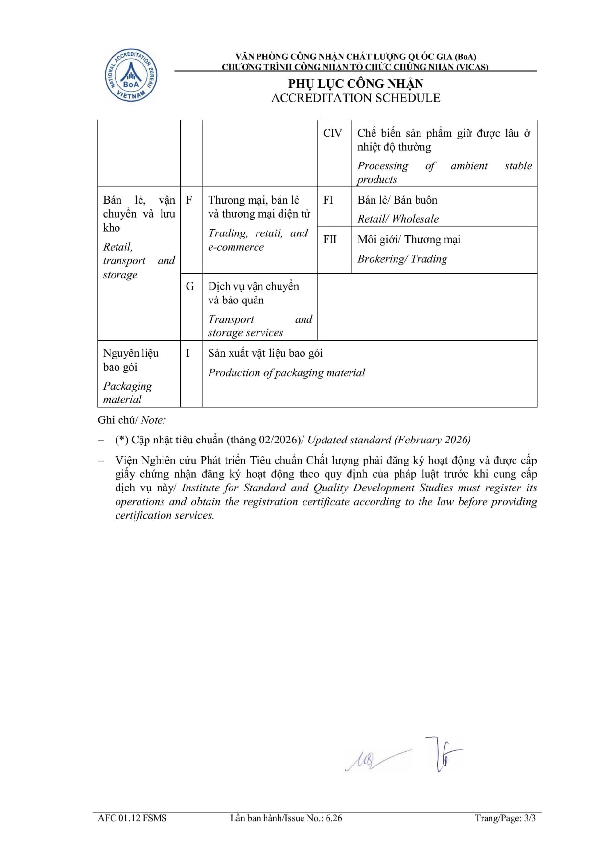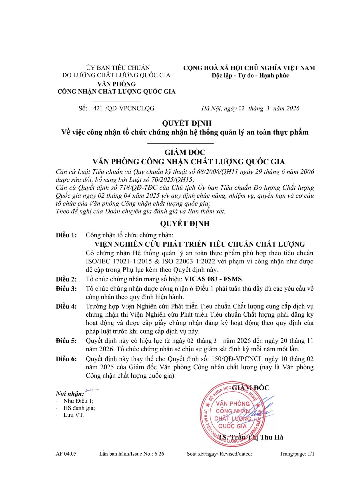 Từ ngày 02/03/2026 Viện Chất lượng ISSQ được công nhận theo Quyết định số 421/QĐ-VPCNCLQG của Giám đốc Văn phòng Công nhận chất lượng quốc gia (BoA) về việc công nhận tổ chức chứng nhận Hệ thống Quản lý An toàn Thực phẩm ISO 22000:2018 phù hợp theo tiêu chuẩn ISO/IEC 17021-1:2015 & ISO/IEC 22003-1:2022. Tổ chức Chứng nhận mang số hiệu: VICAS 083 - FSMS.